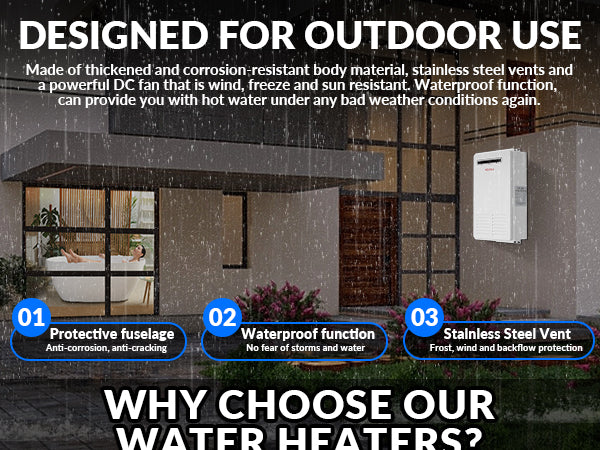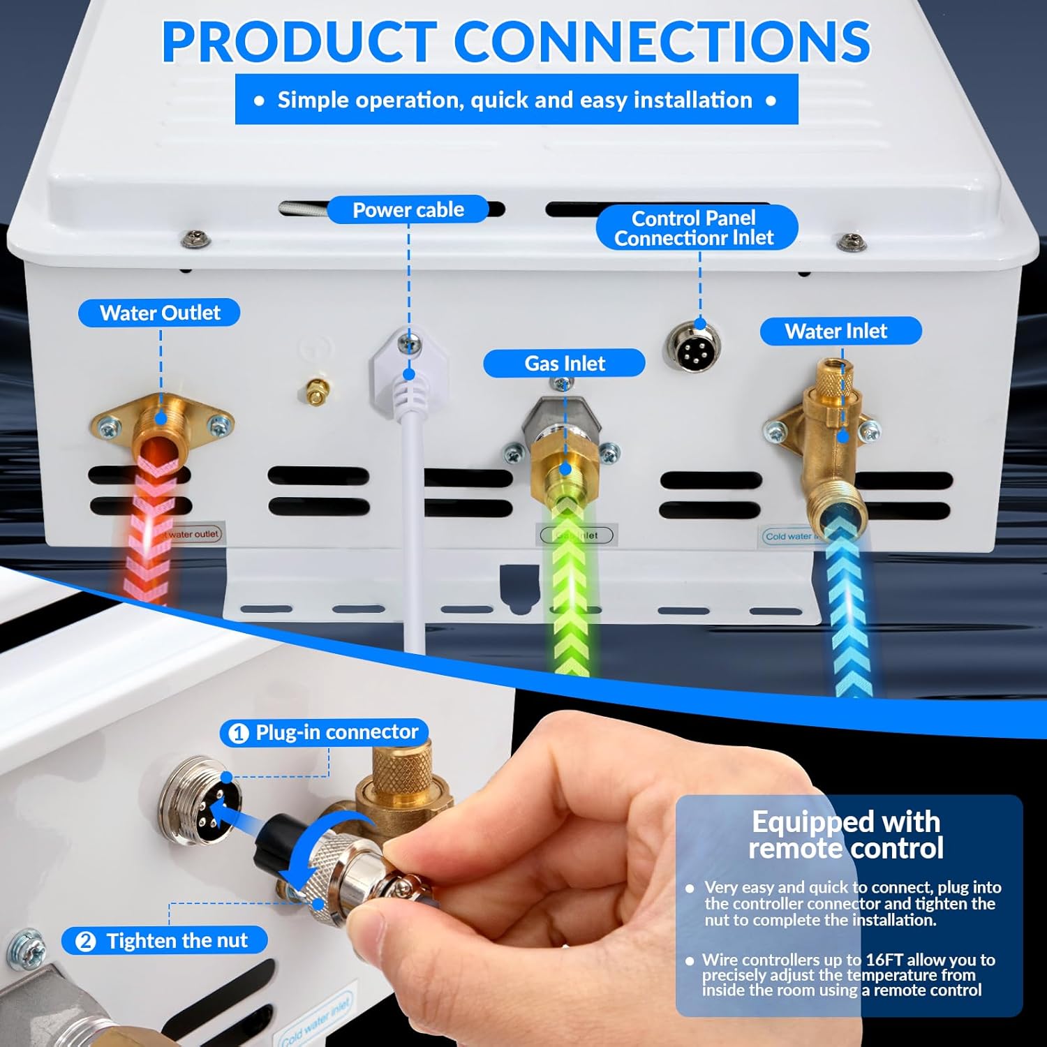 - 【Fast & Convenient Outdoor Installation】– With a space-saving design measuring 22.8" x 14.4" x 5.9", this tankless water heater is built for quick and easy outdoor setup. It includes a remote control panel for simple indoor operation and runs smoothly with low water pressure from 3.16-150 PSI. Just plug it into a standard 120V AC outlet for a reliable and hassle-free power connection.