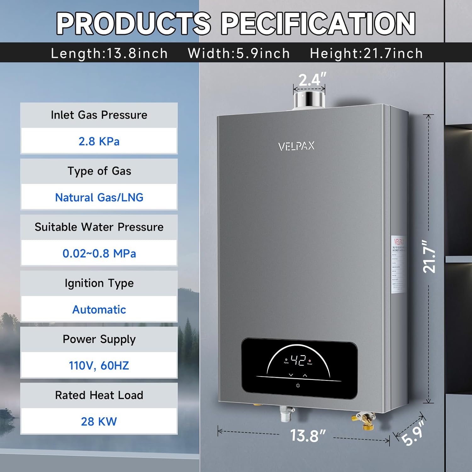 - 【Efficient & Energy-Saving】– With a high-performance output of 68,000 BTU per hour, this 4.74 GPM instant natural gas water heater provides on-demand hot water for 2–3 points of use simultaneously, making it ideal for bathrooms and kitchens. The advanced combustion technology minimizes gas consumption and reduces operational noise for a more efficient and quieter experience.
