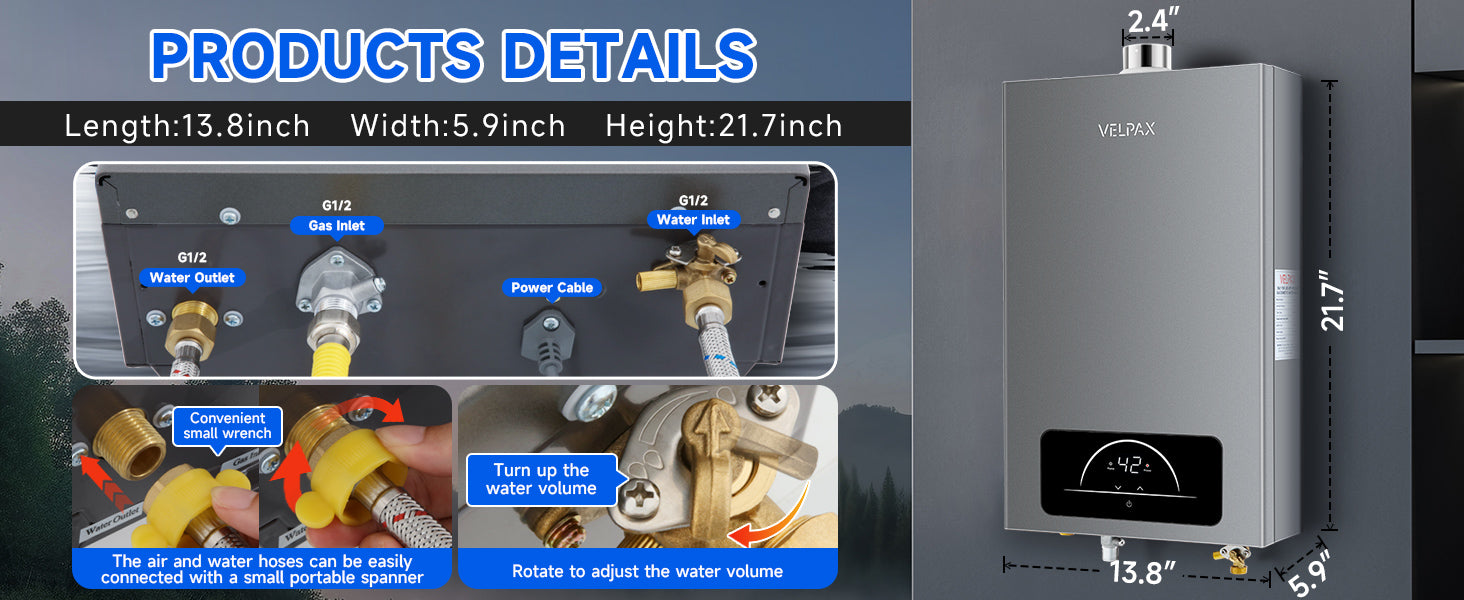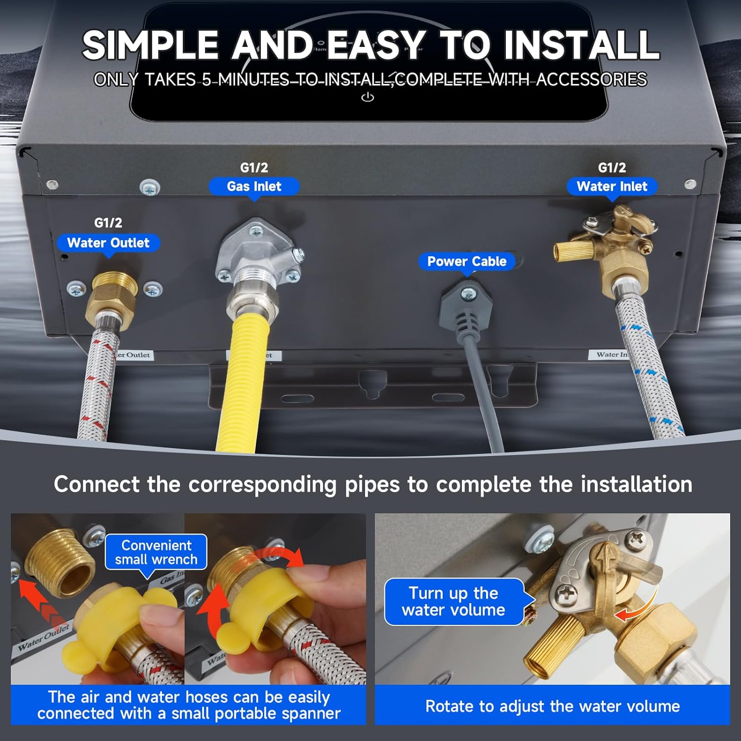 - 【Easy Installation & Use】– This tankless natural gas water heater is designed for quick and hassle-free setup. It comes equipped with standard 1/2" NPT water fittings,gas pipe, inlet and outlet water pipe, and a 2.5" horizontal vent pipe for easy installation. For safe operation, ensure proper ventilation and install a smoke exhaust pipe as required.