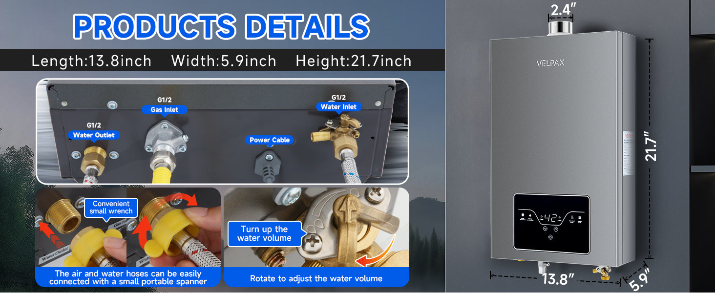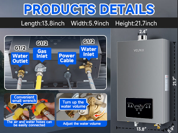 - 【Easy Installation & Use】– This tankless propane water heater is designed for quick and hassle-free setup. It comes equipped with standard 1/2" NPT water fittings,gas pipe, inlet and outlet water pipe, and a 2.5" horizontal vent pipe for easy installation.For safe operation, ensure proper ventilation and install a smoke exhaust pipe as required.