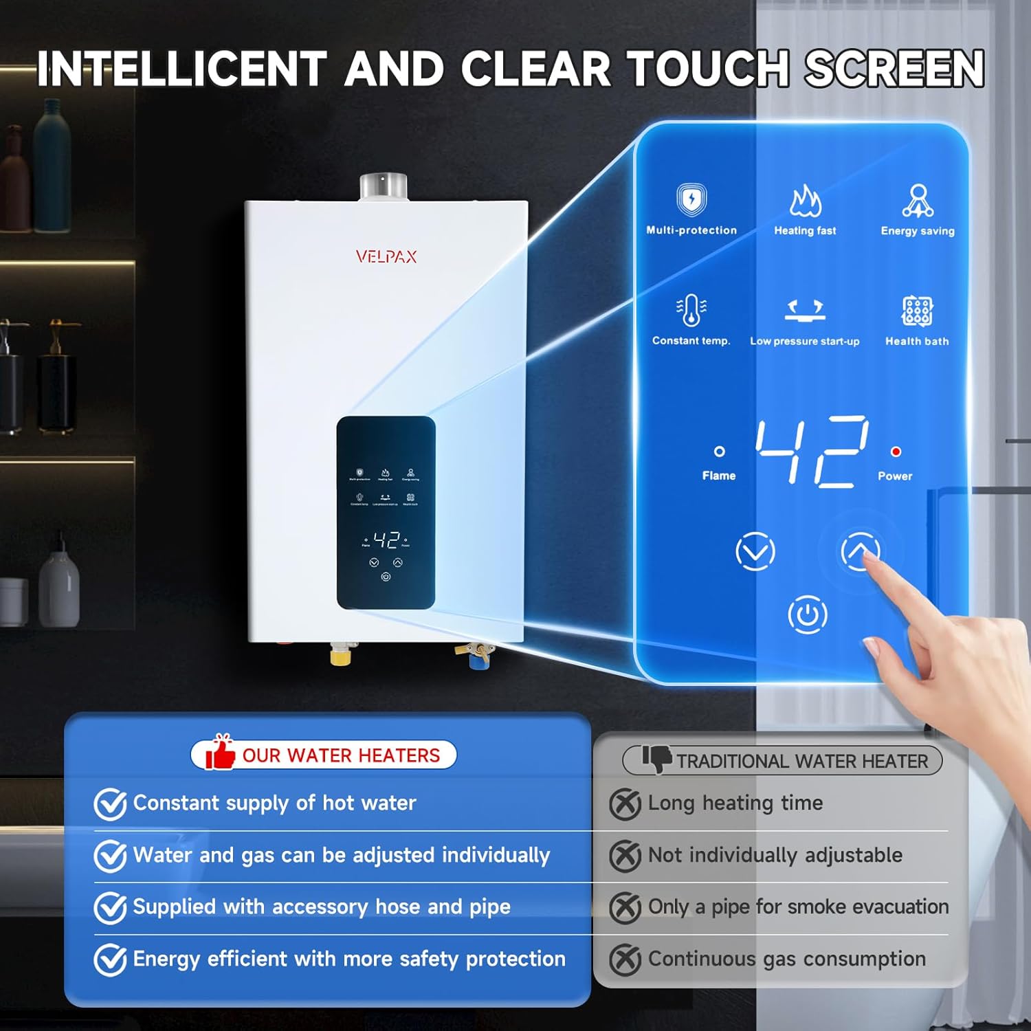 - 【Efficient & Energy-Saving】– With a high-performance output of 68,000 BTU per hour, this 4.21 GPM instant propane water heater provides on-demand hot water for 2–3 points of use simultaneously, making it ideal for bathrooms and kitchens. The advanced combustion technology minimizes gas consumption and reduces operational noise for a more efficient and quieter experience.