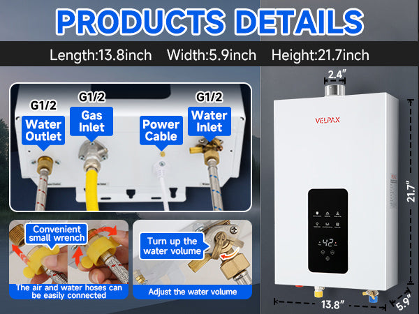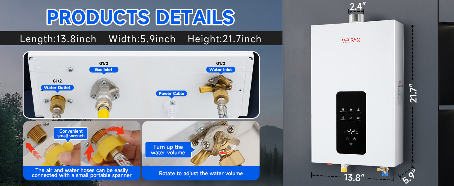 - 【Easy Installation & Use】– This tankless propane water heater is designed for quick and hassle-free setup. It comes equipped with standard 1/2" NPT water fittings,gas pipe, inlet and outlet water pipe, and a 2.5" horizontal vent pipe for easy installation.For safe operation, ensure proper ventilation and install a smoke exhaust pipe as required.